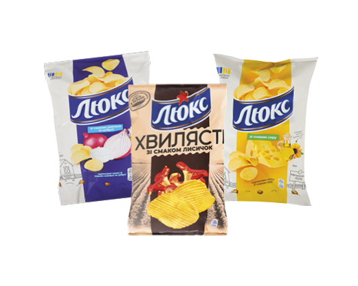 Чипси зі смаком сметани та цибулі, сиру, хвилясті зі смаком лисичок, лосося у вершках, 125 г Люкс™